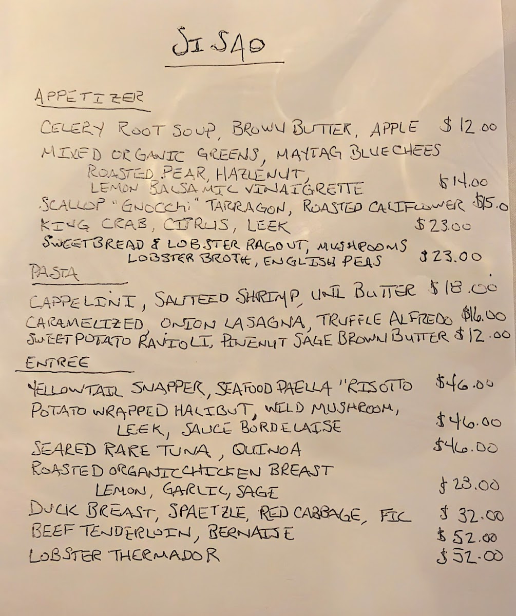 “ I'm happy to say that Chef Brian Held just opened Lambertville’s newest restaurant, Sisao. Chef Brian is already a celebrated name in the local food scene, known for his mastery in creating French culinary delights. Now, he brings his expertise to the fore with the opening of Sisao, a new gem in the heart of Lambertville, located at the nostalgic 9 Klines Court – the very place where his old “Brian's Restaurant” once stood. The renovated space is beautiful and warmly inviting, featuring comfortable furnishings, lush ferns, elegant chandeliers, and an open kitchen that sets the stage. The food, oh the food! Each dish was amazing, from the artistic presentation to the symphony of flavors. The yellowtail snapper with seafood paella risotto, the duck breast with spaetzle, the seared rare tuna, and the caramelized onion lasagna were fabulous. Not to mention the unforgettable scallop gnocchi, quail egg over bacon and rye toast, sweet potato ravioli, and more. Sisao redefines seafood dining, infusing it with the soul of the South of France. but Brian’s menu isn’t just seafood. The menu has other choices– from succulent beef and chicken to perfectly executed duck and imaginative vegetarian dishes. Whether you choose from the a la carte menu during the week or indulge in the weekend's $75 three-course prix fixe, every dish is a testament to Brian's unwavering commitment to quality and creativity. And for wine enthusiasts, Sisao's BYOB policy is a delightful perk, complemented by the wine shop just across the street. Last evening at Sisao was not just a meal, but a memorable experience in fine dining. From the warm welcome to the last bite, everything was impeccable. We left with plans to return, eager to explore more of Chef Brian's culinary creations including Lobster Thermidor and his locally famous Bananas Foster. Please check out Sisao and welcome Chef Brian Held and his lovely wife, Judith, back to Kline's court! ”